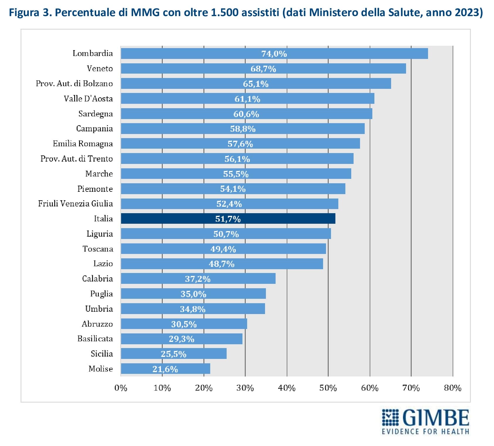 Numero di assistiti per MMG. Secondo i dati SISAC, al 1° gennaio 2023 i 37.260 MMG avevano in carico quasi 51,2 milioni di assistiti, con una media di 1.374 assistiti per medico e variazioni significative tra Regioni: dai 1.100 del Molise ai 1.548 della Provincia autonoma di Bolzano