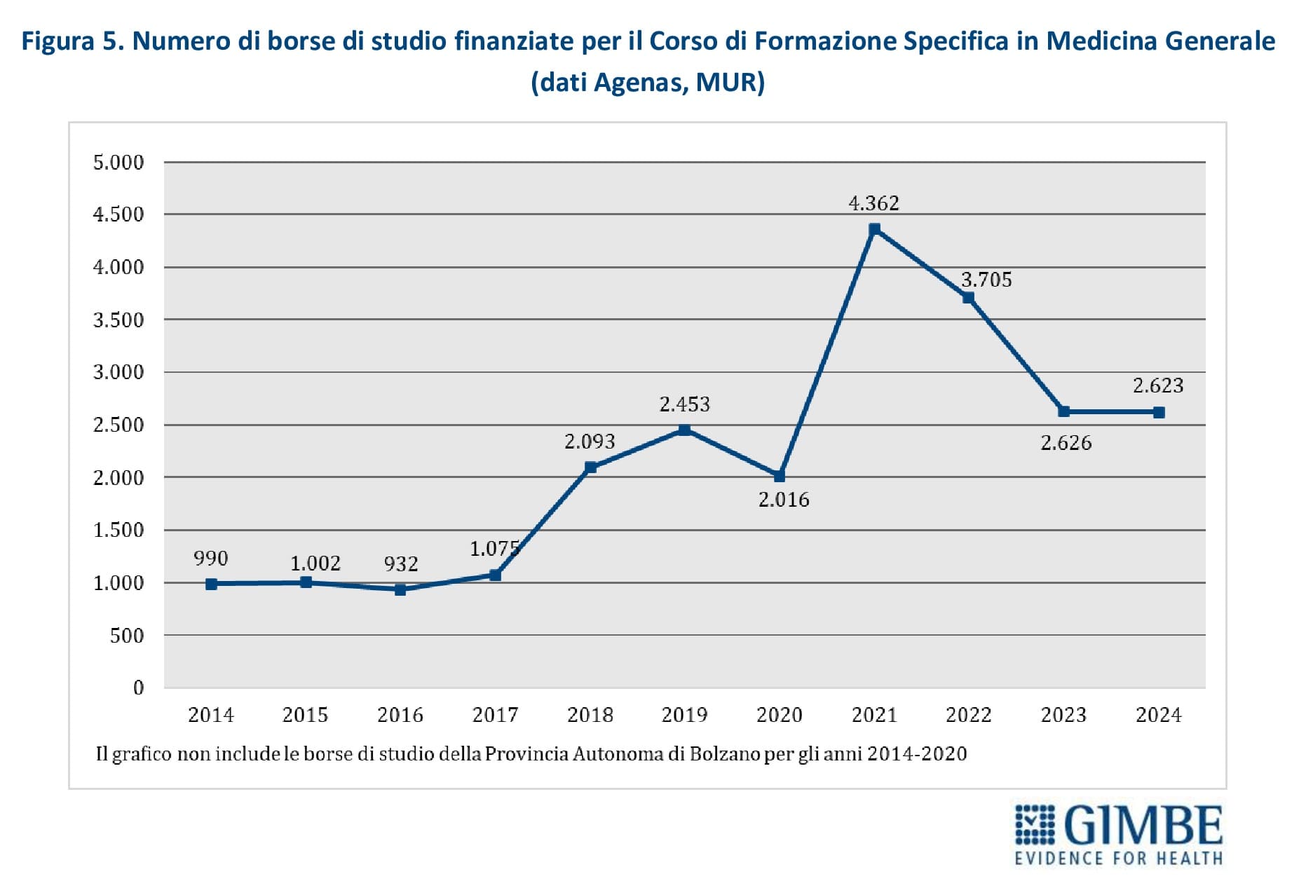 Nuovi MMG. Nel periodo 2014-2017, il numero annuale di borse di studio ministeriali per il Corso di Formazione Specifica in Medicina Generale si è mantenuto intorno a 1.000, un numero largamente insufficiente a coprire il fabbisogno di nuovi MMG rispetto ai pensionamenti attesi. Successivamente, il numero è aumentato sino a 4.362 nel 2021, grazie al sovrapporsi di due finanziamenti straordinari: 3.277 borse stanziate dal DL Calabria (2019-2022) e 2.700 dai fondi del PNRR (2021-2023). Dal 2022, il numero di borse è progressivamente diminuito, stabilizzandosi intorno a 2.600 nel 2023 e nel 2024