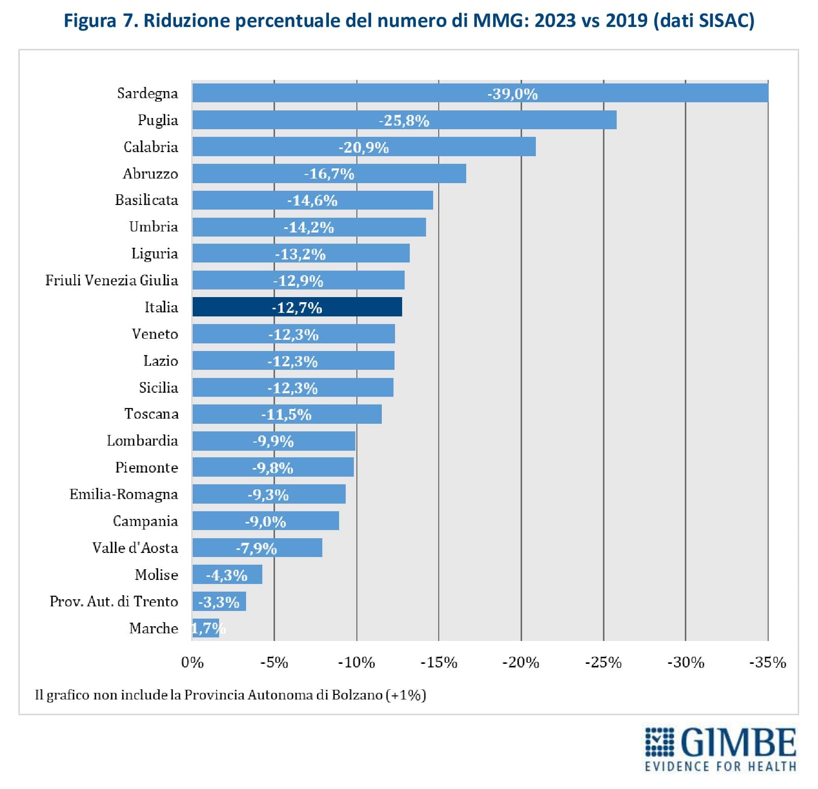 Trend 2019-2023. I dati SISAC documentano una progressiva riduzione dei MMG in tutte le Regioni, ad eccezione della Provincia autonoma di Bolzano (+1%). Tra il 2019 e il 2023, il numero di MMG è diminuito di 4.749 unità (-12,8%), passando da 42.009 a 37.260. Le differenze regionali sono rilevanti: il calo più marcato si registra in Sardegna (-39%), mentre quello più contenuto nelle Marche (-1,7%)