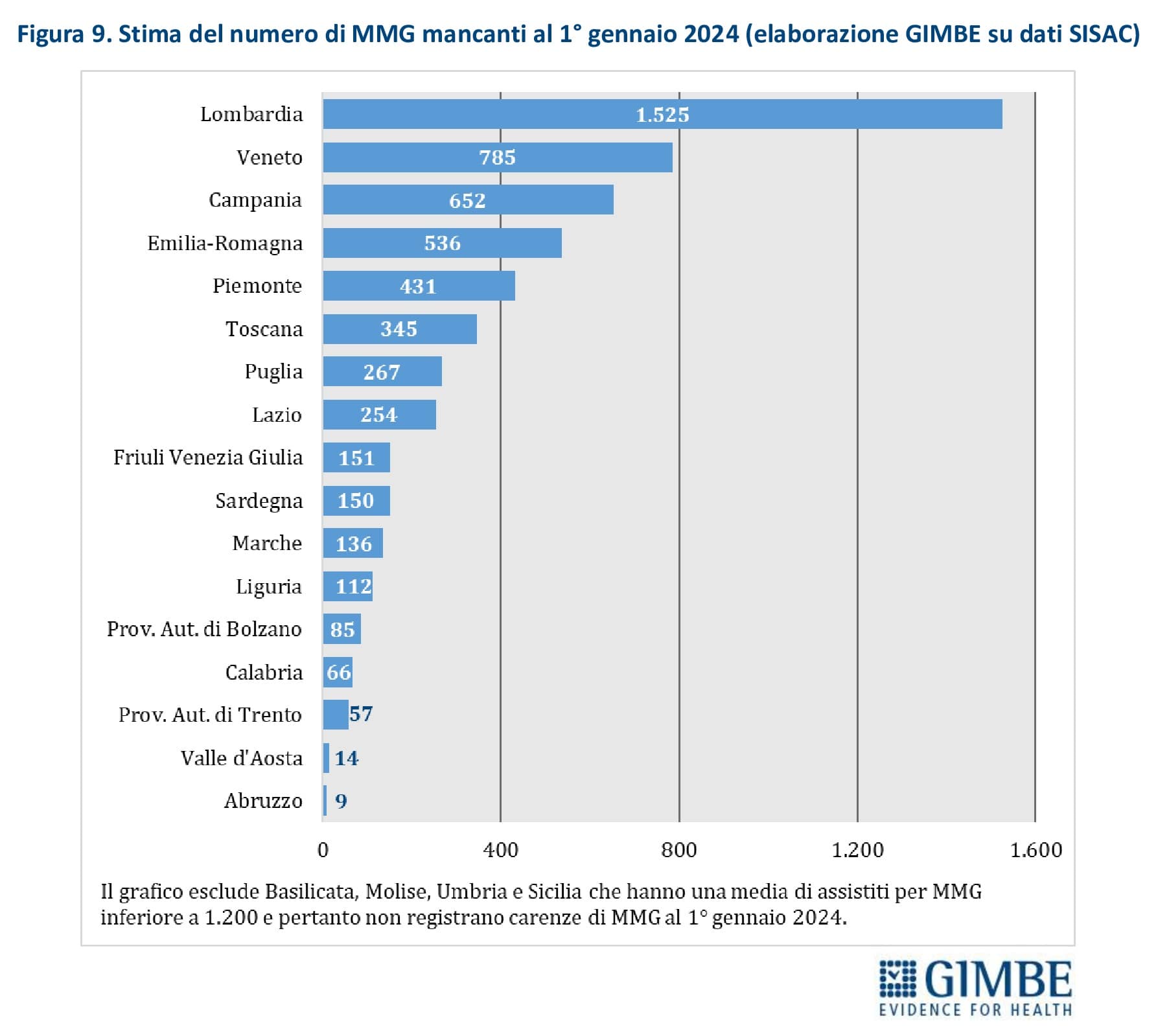 Pensionamenti. Secondo i dati forniti dalla Federazione Italiana dei Medici di Medicina Generale (FIMMG), tra il 2024 e il 2027 ben 7.345 MMG hanno raggiunto/raggiungeranno il limite di età per la pensione fissato a 70 anni, deroghe a parte. Il numero di pensionamenti varia significativamente tra le Regioni: dagli 11 della Valle D’Aosta ai 1.000 della Campania.