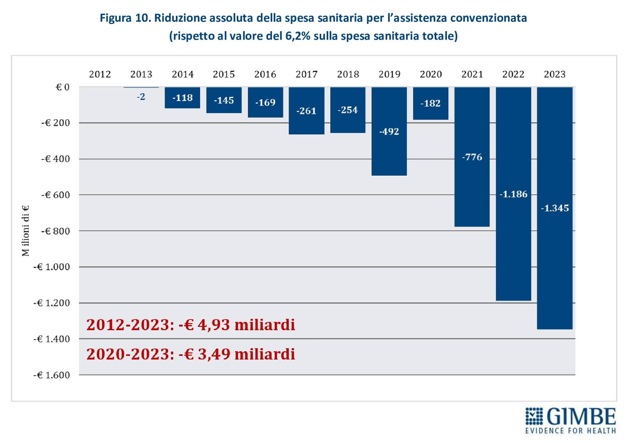 Impatto economico. La quota di spesa sanitaria pubblica destinata all’assistenza medico-generica da convenzione (medici di famiglia, pediatri di libera scelta e specialisti ambulatoriali) è diminuita dal 6,2% nel 2012 al 5,2% nel 2023. Se la spesa percentuale si fosse mantenuta ai livelli del 2012, negli ultimi 11 anni il personale convenzionato non avrebbe perso € 4,93 miliardi, di cui € 3,49 miliardi tra il 2020 e il 2023.