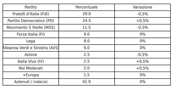 Il Movimento 5 Stelle , invece, perde lo 0,5% e va all’ 11,5%. Forza Italia è stabile al 9,0% come la Lega che resta all’8%. Stabile anche Alleanza Verdi e sinistra al 6,0%, Azione perde lo 0,5% mentre Italia Viva lo guadagna, entrambe si attestano 2,5%. Noi moderati entrambi all’2,0% sale di mezzo punto mentre +Europa è all’ 1,5% come nella scorsa rilevazione. Anche gli astenuti rimangono al 41%.