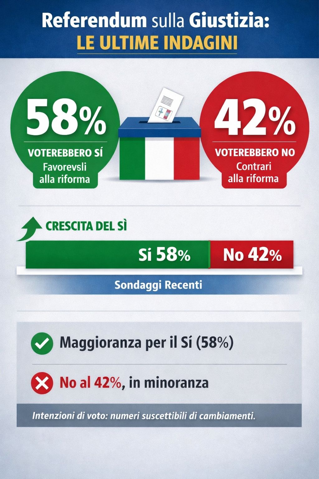 Ebbene, ad oggi i sondaggi danno un’affluenza attorno al 43% (ricordiamo che essendo referendum costituzionale non necessita do un quorum), con il Sì alla riforma del Centrodestra che cresce fino al 58% davanti al 42% raccolto dal No. Interessante il dato sugli elettorati, con la maggioranza ampiamente a favore del referendum (82%) mentre in casa Centrosinistra il Sì è comunque dato al 37%, ancora più in equilibrio per l’elettorato 5Stelle che si spacca di fatto a metà tra sostenitori (48%) e contrari (52%) alla riforma Nordio.