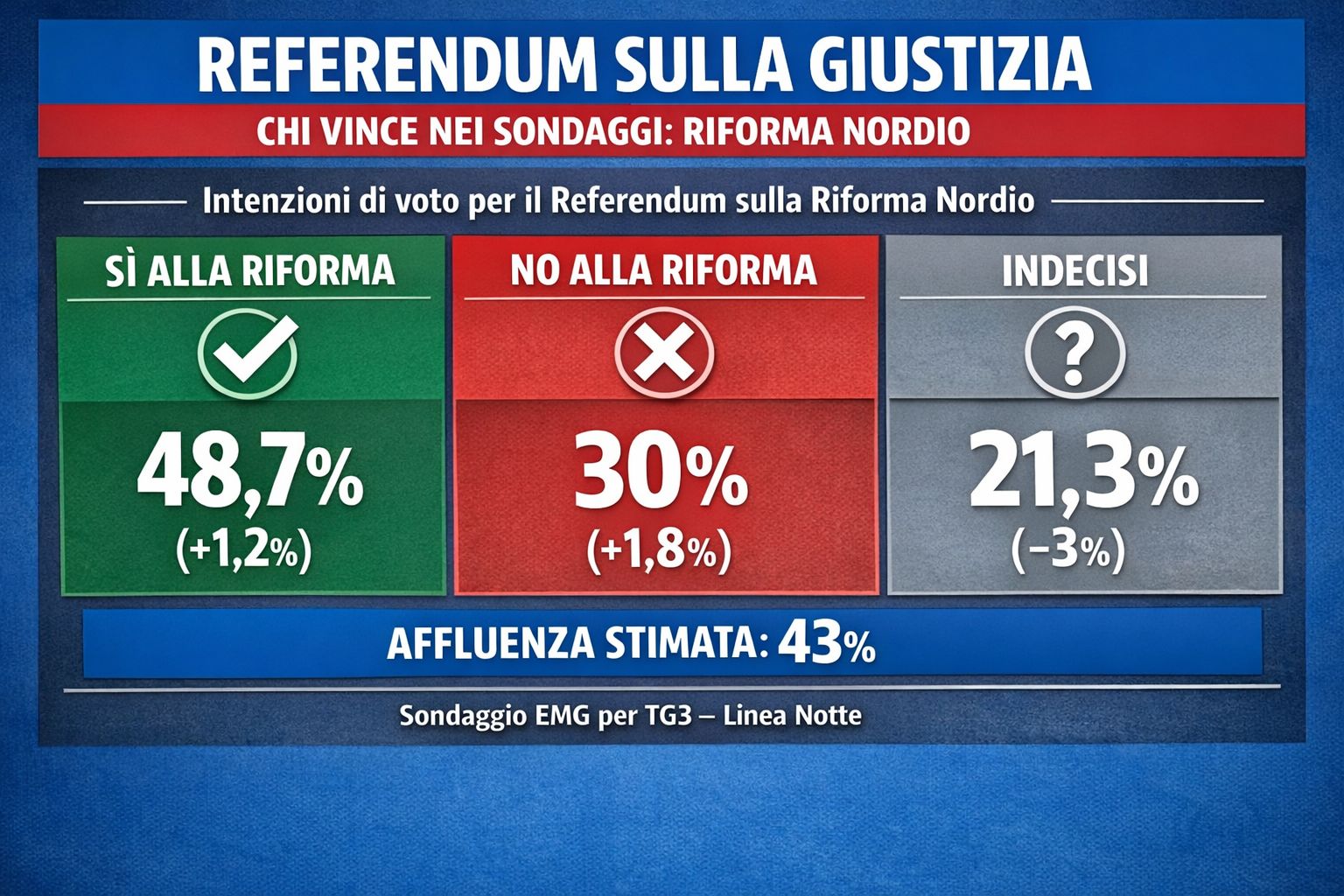 I Sì al referendum sulla giustizia, che contiene la separazione delle carriere, sono però ancora in netto vantaggio, secondo quanto rilevato giovedì dal sondaggio Emg per il Tg3 diretto da Pierluca Terzulli, che è andato in onda a Linea Notte: i favorevoli alla riforma sono infatti al 48,7% (+1,2% rispetto alla settimana precedente) mentre i No si fermano al 30% (+1,8%), con una affluenza alle urne stimata al 43%. Gli indecisi sono il 21,3%, in calo di 3 punti percentuali rispetto alla settimana precedente.