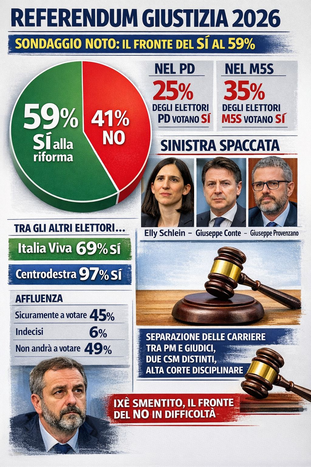 Sondaggi politici 2026, Noto smentisce Ixè sul referendum sulla giustizia perché il fronte del Sì è al 59% e tra elettori Pd-M5s e leader c'è una spaccatura.