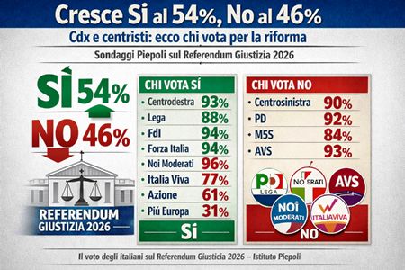 Cresce Sì al 54%, No 46%/ Cdx e centristi: ecco chi vota per la riformaI sondaggi Piepoli sul Referendum Giustizia 2026 con il contro-recupero del Sì a +8% sul No progressista: tutti i numeri e come votano i partiti.