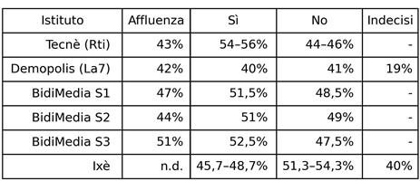 Il primo sondaggio che consideriamo è quello di Tecnè per Rti, che risale al periodo tra il 17 e il 19 febbraio. Tra chi dice che andrebbe a votare, ovvero il 43%, il Sì sarebbe tra il 54% e il 56% e il No tra il 44% e il 46%. Ben diversa la situazione analizzata da Demopolis per Otto e Mezzo, su La7. Anche questo sondaggio risale a qualche giorno fa (tra il 18 e il 19 febbraio): in questo caso il Sì sarebbe al 40% ma il No sarebbe avanti con il 41%. Ampia la fetta degli indecisi, pari al 19%. L’affluenza sarebbe al 42%.