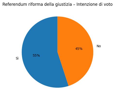 Il sì avanti nel referendum sulla riforma della giustizia in programma il 22 e 23 marzo 2026. Nell’ultimo sondaggio Youtrend per Sky Tg24 è stata chiesta agli italiani l’intenzione di voto in vista della consultazione. Il sì è al 55% e il no al 45%, con un’affluenza stimata al 62%. In questo caso, a differenza dei referendum abrogativi, non è previsto un quorum.