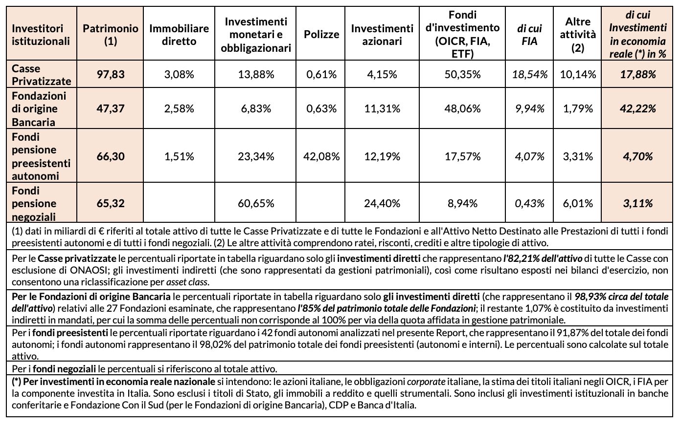 Crescono infine gli investimenti in economia reale nazionale, finalizzati a generare ricadute positive per il territorio. Anche per il 2021, le Fondazioni di origine Bancaria si riconfermano i maggiori investitori nell’economia domestica, con circa il 42% del patrimonio investito, sostenuto da un’esposizione nella banca conferitaria, in Cassa Depositi e Prestiti e Fondazione Con il Sud pari al 27,7%; seguono le Casse Privatizzate dei liberi professionisti, con il 18% circa, mentre si conferma modesta la quota investita nel Paese da parte di fondi pensione negoziali e preesistenti, che si fermano rispettivamente al 4,7% e al 3,11% del patrimonio.