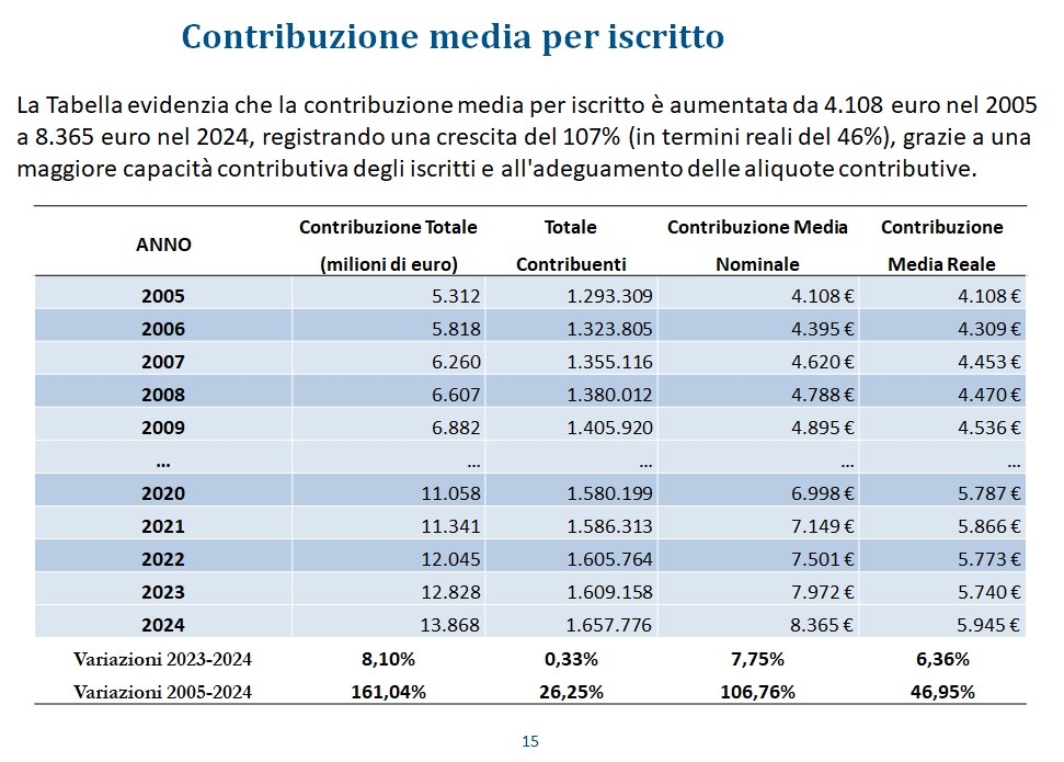 La contribuzione media per iscritto è aumentata da € 4.108 nel 2005 a € 8.365 nel 2024, registrando una crescita del 107% (in termini reali del 46%) grazie a una maggiore capacità contributiva degli iscritti e all’adeguamento delle aliquote contributive.” (Fonte ibidem)