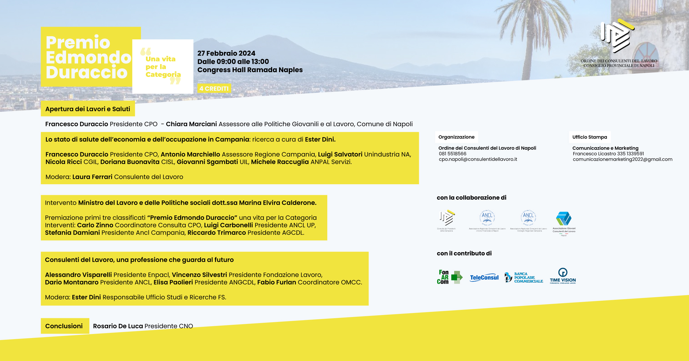 di occupazione è arrivato al 45%. Ci sono, tuttavia, alcune note dolenti: l’occupazione femminile è ancora lontana dal recupero dei livelli pre-Covid e si registra un significativo aumento dei contratti a termine. Sono alcuni dati evidenziati nel rapporto regionale “Lo stato di salute dell’economia e dell’occupazione in Campania” della Fondazione Studi Consulenti del Lavoro presentato oggi nel corso dell’evento “Premio Duraccio – Una vita per la Categoria”, promosso dal Consiglio Provinciale dell’Ordine dei Consulenti del Lavoro di Napoli. A spingere maggiormente verso la crescita è stato il settore delle costruzioni che con la ripresa del commercio e del turismo e dei servizi di informazione hanno segnato ottimi risultati anche sul fronte dell’export; a settembre 2023, infatti, la Campania ha registrato, tra tutte le regioni italiane, un incremento del 27,6% del valore delle esportazioni. Segnali positivi per una Regione che è ancora in coda alla classifica nazionale in termini di capacità produttiva. Nel 2022, assieme a Sicilia e Calabria, la Campania presentava infatti il più basso valore di PIL pro capite (pari a 21.241 euro), leggermente più basso di quello medio delle regioni del Sud. L’occupazione nel 2023 è aumentata del 2%, mentre rispetto al 2019, la crescita è stata del 2,6%; dinamica regionale migliore rispetto a quella nazionale (tra 2019 e 2023 l’incremento degli occupati è stato dell’1,7%), ma meno evidente di altre regioni del Mezzogiorno. Giovani e senior sono i soggetti che hanno beneficiato maggiormente della positiva congiuntura; tra il 2019 e il 2022 la crescita più significativa si è registrata tra la popolazione di 25-34 anni (+4,9%) e quella più adulta, tra i 50 e i 64 anni (+4,8%). In aumento anche i livelli di partecipazione giovanile al mercato. Il tasso di occupazione tra i 15-24enni passa dall’11,9% del 2019 al 12,3% del 2022; ma è nella fascia d’età 25-34 anni che si ha l’incremento più rilevante: se nel 2019 lavorava il 41% dei giovani appartenenti a questa classe di età, nel 2022, il dato è salito al 46,4%. Ma non tutta l’occupazione cresce. Quella femminile è sostanzialmente ferma. Rispetto al 2019, le lavoratrici nel 2023 registrano un -2,2%. Il dato regionale è peraltro in forte controtendenza sia rispetto a quello nazionale che al resto delle regionali meridionali. Al terzo trimestre 2023, la Campania registrava il più basso livello di partecipazione delle donne al lavoro, con un tasso di occupazione del 30,9% contro il 35,7% del Sud e il 52,2% del Paese. È evidente come la settorialità dei processi di crescita, che hanno privilegiato edilizia e industria manifatturiera, due comparti a tradizionale vocazione maschile, non abbia favorito la componente femminile del mercato del lavoro, aumentando il divario di genere interno allo stesso. Va sottolineato, infine, come la crescita occupazionale della Regione non si è accompagnata a un miglioramento della condizione contrattuale degli occupati. Stando agli ultimi dati regionali Istat, riferiti al 2022, l’incremento occupazionale è avvenuto