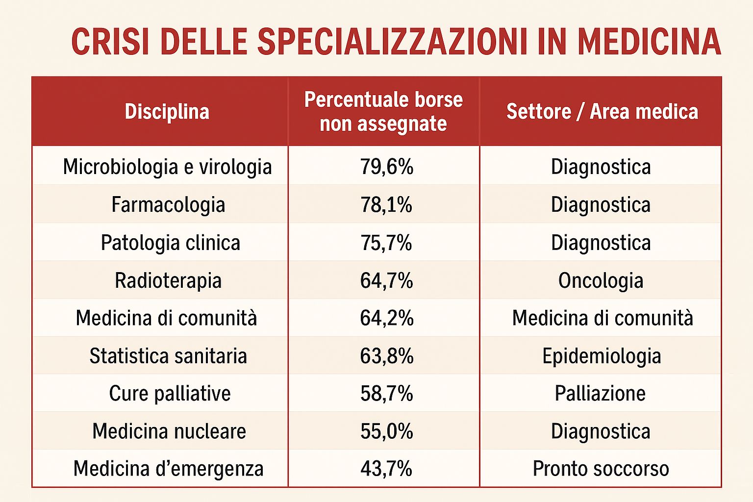 A livello generale, il quadro è preoccupante anche per altre aree specialistiche che registrano percentuali elevate di borse non assegnate. In particolare, in radioterapia il 64,7% di borse risulta non assegnato, in medicina di comunità il 64,2% e in statistica sanitaria il 63,8%.