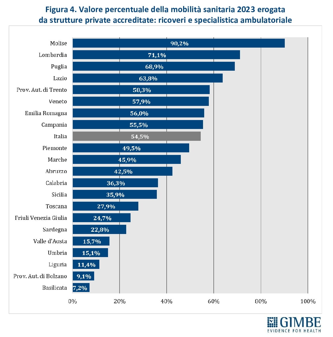 Il ruolo del privato convenzionato. Oltre 1 euro su 2 speso per ricoveri e prestazioni specialistiche erogate fuori Regione viene incassato dalla sanità privata convenzionata: € 1.966 milioni (54,5%), contro i € 1.643 milioni (45,5%) destinati alle strutture pubbliche. «La quota di mobilità che confluisce verso il privato convenzionato – sottolinea Cartabellotta – non è omogenea in tutte le Regioni, perché dipende dall’offerta e dalle capacità attrattive di strutture private d’eccellenza». Infatti, le strutture private assorbono oltre il  60% della mobilità attiva in Molise (90,2%), Lombardia (71,1%), Puglia (68,9%) e Lazio (63,8%).