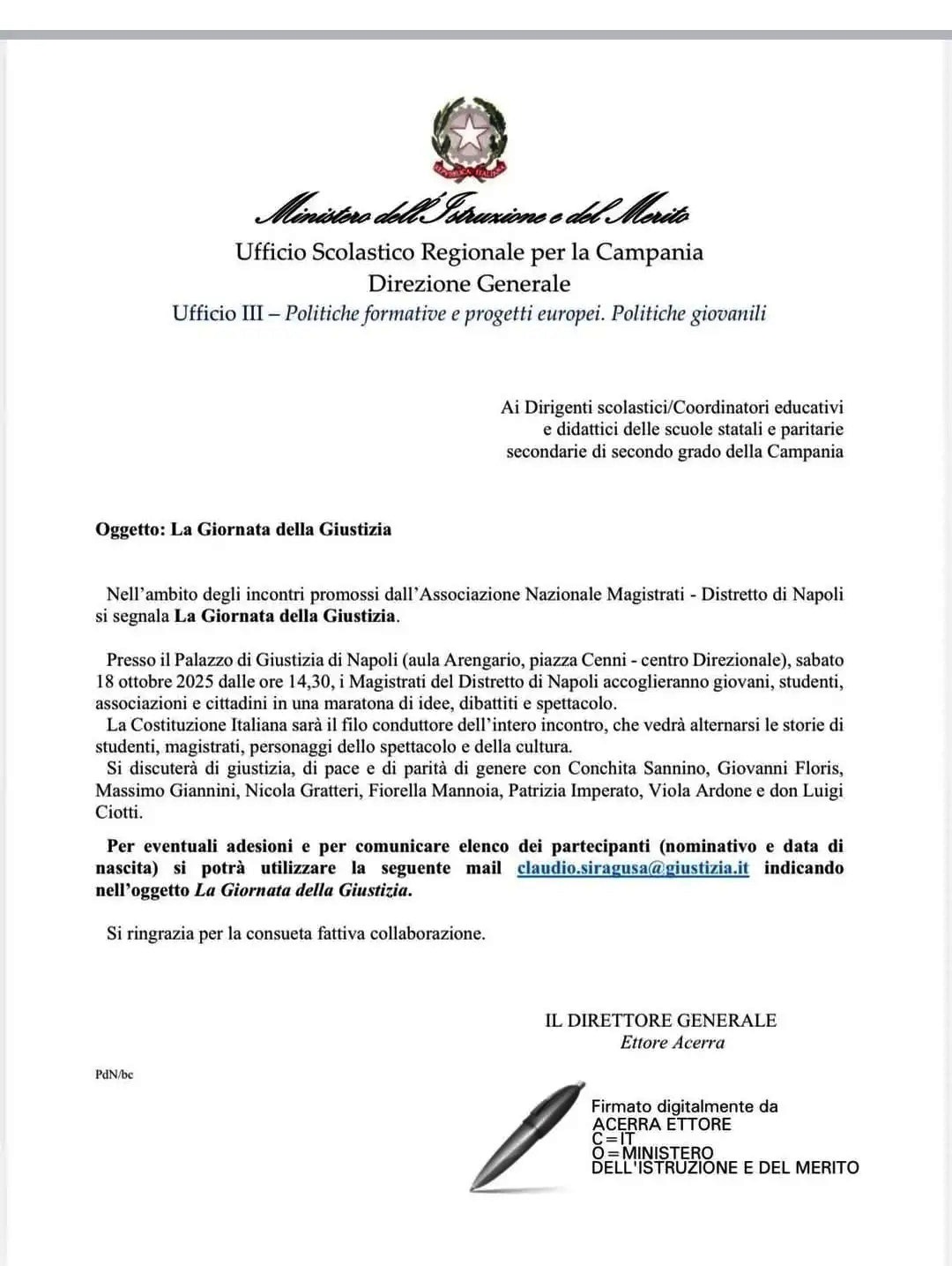 Solo per completezza, riportiamo il resto della comunicazione girata dal provveditore ai prèsidi: “Presso il Palazzo di giustizia di Napoli – aula Aregario, piazza Cenni, Centro direzionale (non sia mai e i ragazzi si perdevano, nda) sabato 18 ottobre 2025, dalle ore 14,30 i Magistrati del Distretto di Napoli accoglieranno giovani, studenti associazioni e cittadini in una maratona di idee, dibattiti e spettacolo”. E poi: “La Costituzione italiana sarà il filo conduttore dell’intero incontro (e qui sembra risuoni l’eco della strampalata tesi per cui separare le carriere sarebbe incostituzionale seppur lo si faccia nel rispetto dell’articolo 138, ndr). Si discuterà di giustizia, di pace e di parità di genere con Conchita Sannino, Giovanni Floris, Massimo Giannini, Nicola Gratteri, Fiorella Mannoia…”, e via con gli altri protagonisti dell’happening.