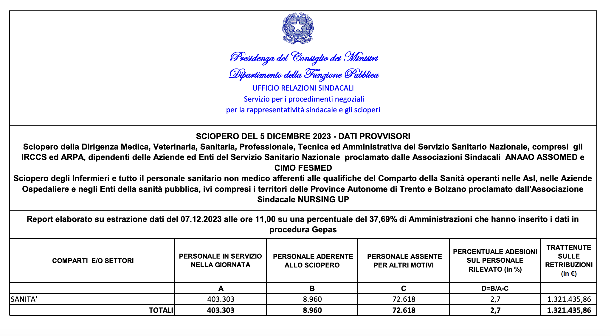 Dall’altro lato però le statistiche ufficiali del Governo pubblicate dal Ministero della Funzione Pubblica forniscono altri numeri. Secondo l’aggiornamento al 7 dicembre basato sui dati trasmessi da circa il 37% delle strutture l’adesione allo sciopero sarebbe stata del 2,7%. Il dato oltre ad essere provvisorio è certamente da prendere con le molle anche perché la percentuale di adesione è calcolata sul totale del personale in servizio in quel giorno (400 mila persone) e non su chi effettivamente è iscritto ai sindacati che hanno scioperato e senza considerare come tutte le urgenze sono state garantite.