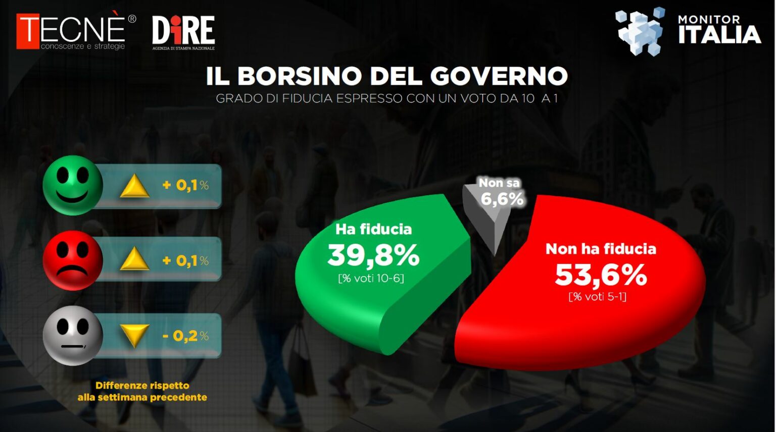 Il 53,6% degli elettori non ha fiducia nell’esecutivo, percentuale in salita dello 0,1% rispetto a una settimana fa. Aumenta però, seppur di poco, anche la percentuale di chi ha fiducia nell’esecutivo guidato da Giorgia Meloni, che guadagnando lo 0,1% si attesta al 39,8%. Non sa il 6,6% (-0,2%).