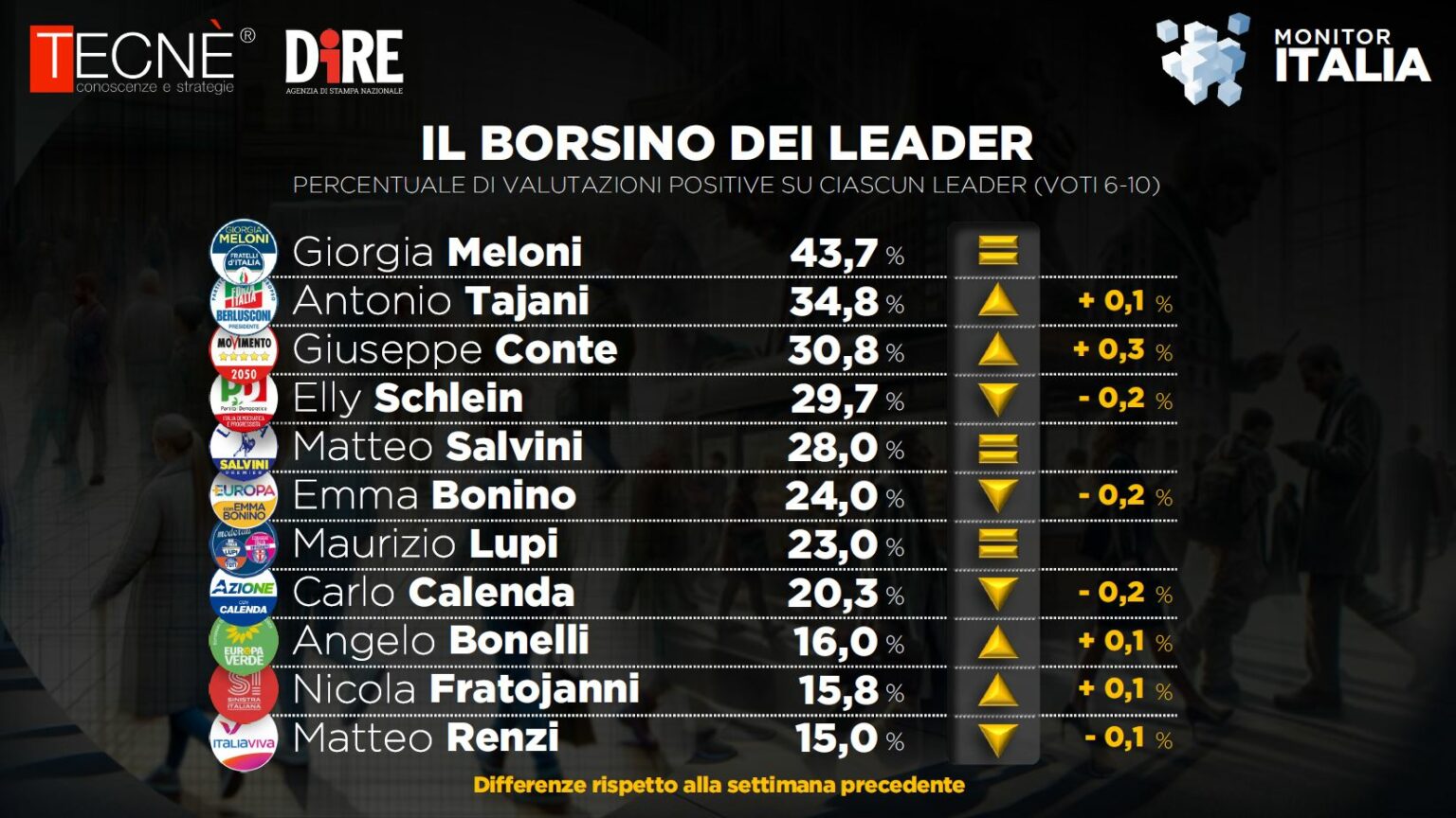 Il borsino dei leader politici verso le Europee vede Giorgia Meloni saldamente in testa con il 43,7%, invariata rispetto alla scorsa settimana, seguono Antonio Tajani con il 34,8% (+0,1%) e Giuseppe Conte con il 30,8% (+0,3%, il maggior incremento tra tutti i leader, seppur contenuto).