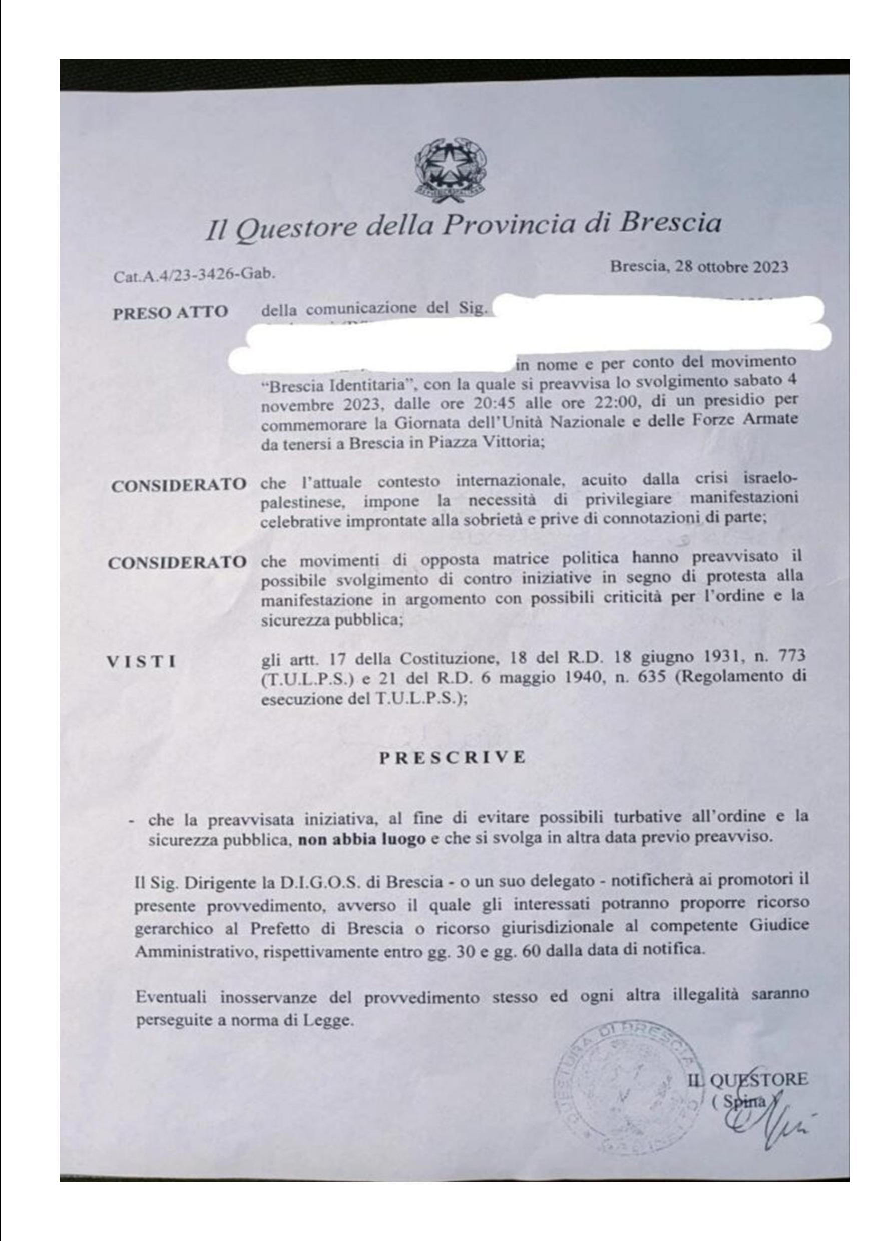 La Vittoria a Brescia, la Leonessa d’Italia, non si deve festeggiare. “Non s’ha da fare”, per dirla alla manzoniana (mi si perdoni la ripetività su questa citazione, ma davvero non credo ne esista una più identificativa degli atteggiamenti mafiosi della cultura dominante). Il motivo? Pretesti e – perdonate il termine – cazzabubbole. Nell’ordinanza del questore si legge del complicato contesto internazionale legato al confilitto israelo-palestinese e della necessità di evitare “manifestazioni di parte”. Per non parlare del terzo punto, ancora più comico, visto che si riferisce alla conoscenza di eventuali manifestazioni di stampo contrario. Insomma, non si può festeggiare il 4 novembre perché sarebbe “di parte”. Ma “di parte” cosa, cara questura? L’unica “parte” che rappresenta la Vittoria del 1918 è L’Italia. E chiunque viva e lavori in questo Paese dovrebbe ricordarsene. Tralascio, veramente per pietà, le sciocchezze sui conflitti in Medio Oriente e la presenza di qualcuno – ovviamente anti-italiano – a cui potrebbe non stare bene festeggiare il compimento del processo risorgimentale.