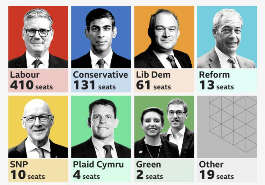 I Laburisti vanno oltre ogni più rosea previsione e conquistano 410 seggi su 650, andando ben oltre la maggioranza assoluta e sfiorando il record di 419 conquistati da Tony Blair.
