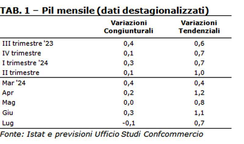 Si conferma un secondo trimestre per niente brillante, ma con una stima previsionale al rialzo della variazione congiunturale del prodotto lordo da -0,1% a +0,1%. Tre gli elementi alla base di questa revisione al rialzo: i consumi, trainati dalle immatricolazioni di auto a privati nel mese di giugno, il buon andamento congiunturale della produzione industriale a maggio (+0,5%) e, sempre per il mese di maggio, una valutazione favorevole delle presenze turistiche sul territorio italiano. Lo riferisce Confcommercio.