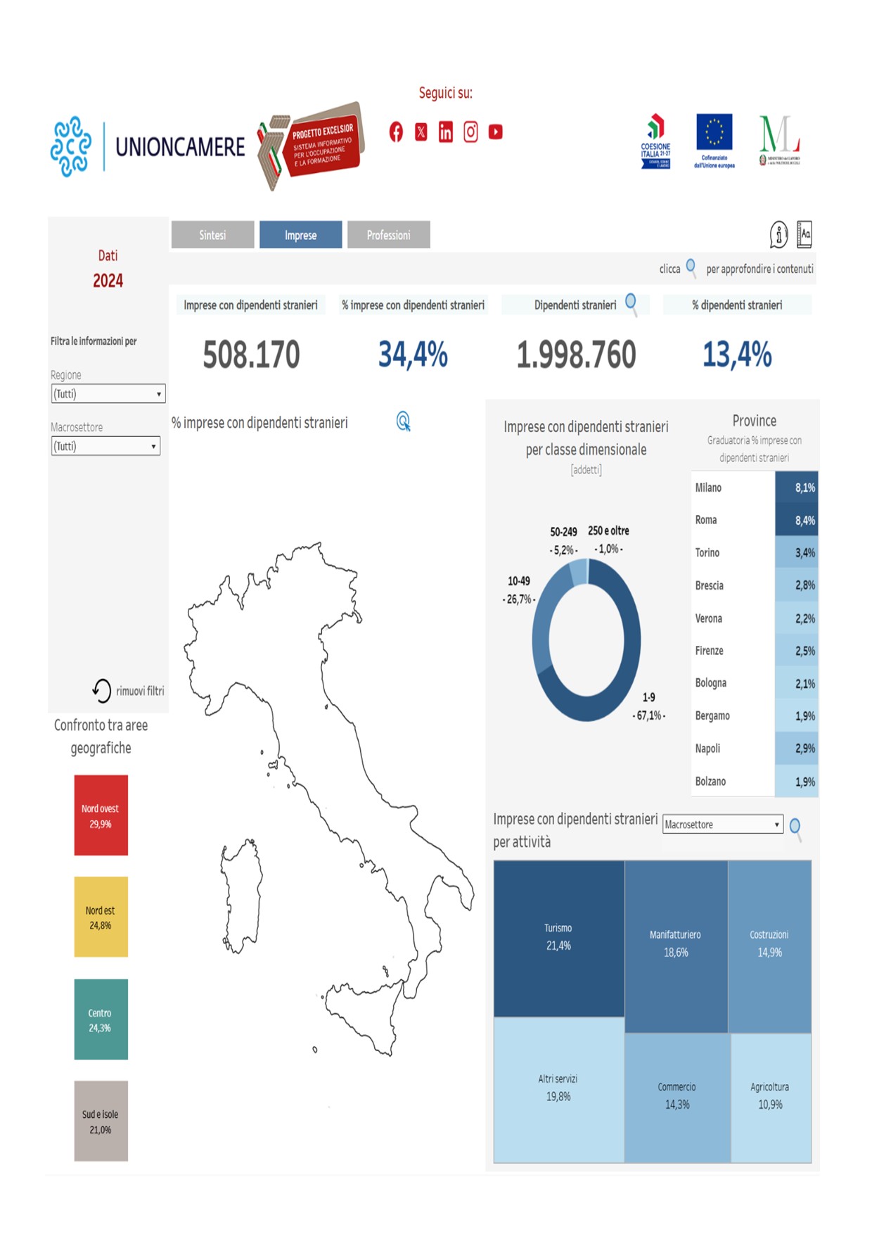 Da oggi è online sul sito del Sistema informativo Excelsior (excelsior.unioncamere.net) e sul Portale Integrazione Migranti (Integrazionemigranti.gov.it) la dashboard dedicata al monitoraggio dei fabbisogni di lavoratori stranieri espressi dalle imprese italiane. Questo nuovo strumento è stato realizzato da Unioncamere e Ministero del Lavoro e delle Politiche Sociali nell’ambito del Progetto Excelsior, grazie al Programma nazionale Giovani, donne e lavoro cofinanziato dall’Unione europea.