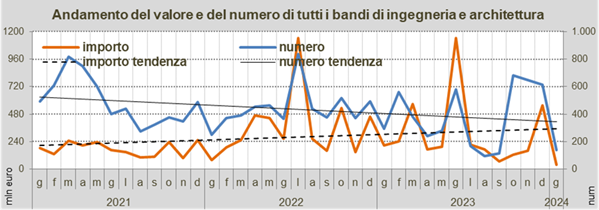 Nel mese di gennaio 2024 per servizi di ingegneria e architettura (escluse le progettazioni esecutive degli appalti integrati) sono stati rilevati 141 bandi per 38,6 milioni, con cali del 52,0% in numero e dell’81,3% in valore sul mese di gennaio 2023, rispetto a dicembre 2023 il numero scende del 77,0% e del 93,1% in valore. I valori raggiunti in questo mese, sia nel numero sia nel valore, sono tra i più bassi dell’intera serie storica dell’osservatorio dal 1996.