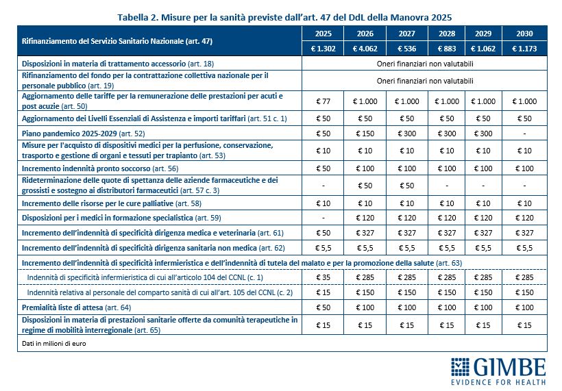 L’art. 47 sul “Rifinanziamento del Servizio Sanitario Nazionale” individua 15 articoli con le misure da finanziare. «Tuttavia, se da un lato quasi tutte le misure previste dalla Manovra sono a valere sul FSN – spiega Cartabellotta – lascia molto perplessi il fatto che gli incrementi annuali del FSN non siano sufficienti a coprire tutte le misure previste. Di conseguenza le Regioni, per riuscire a realizzare tutti gli obiettivi previsti dalla Legge di Bilancio 2025 per la sanità, dovranno operare scelte drastiche: razionalizzare la spesa, tagliare altri servizi o aumentare l’addizionale IRPEF». Ad esempio, nel 2026, a fronte di un aumento del FSN di € 4.062 milioni, sono previste misure per un totale di € 2.372,5 milioni, senza considerare il trattamento accessorio (art. 18) e il rifinanziamento del fondo per la contrattazione collettiva nazionale per il personale pubblico (art. 19).