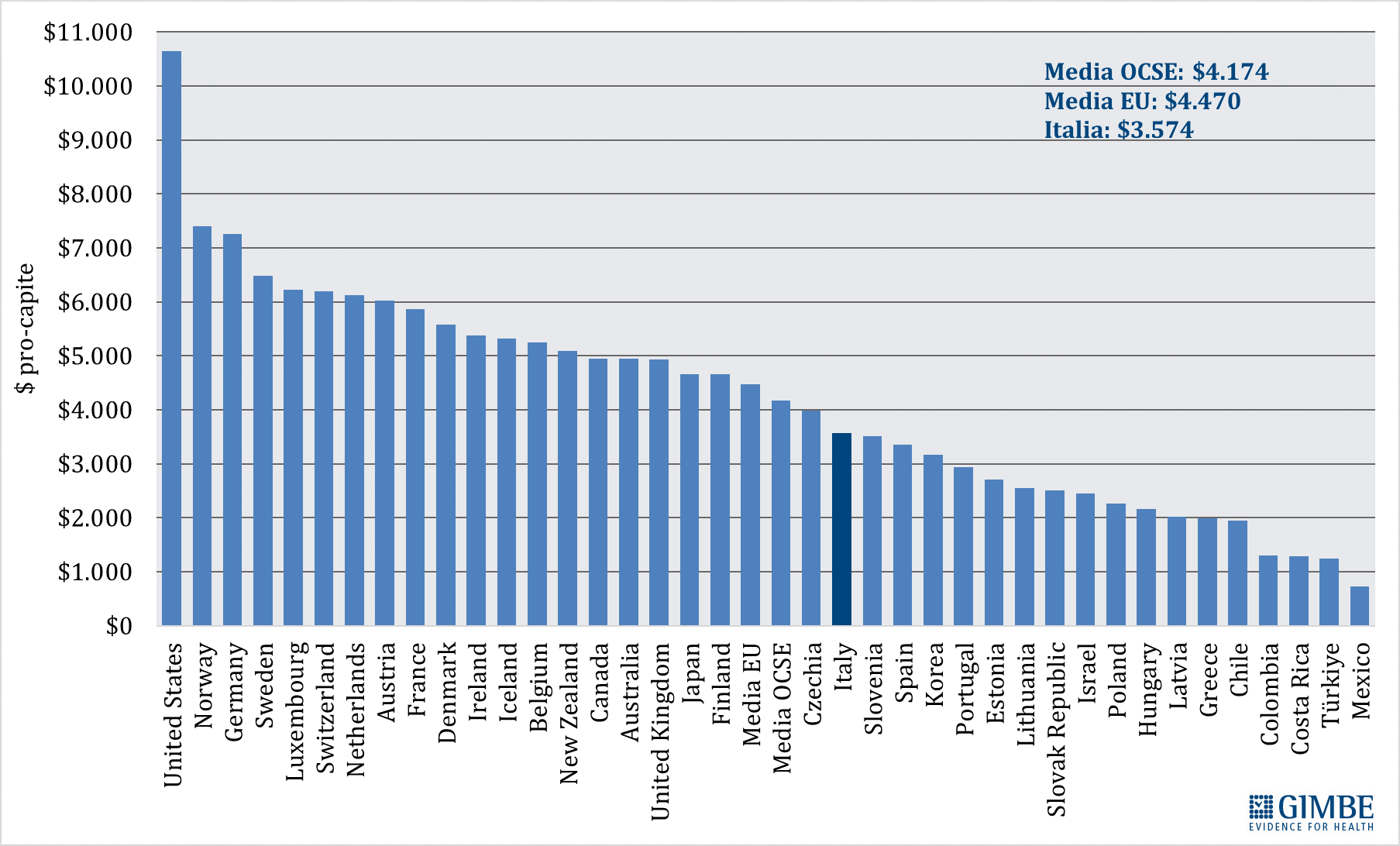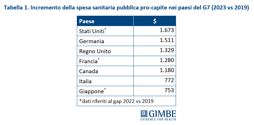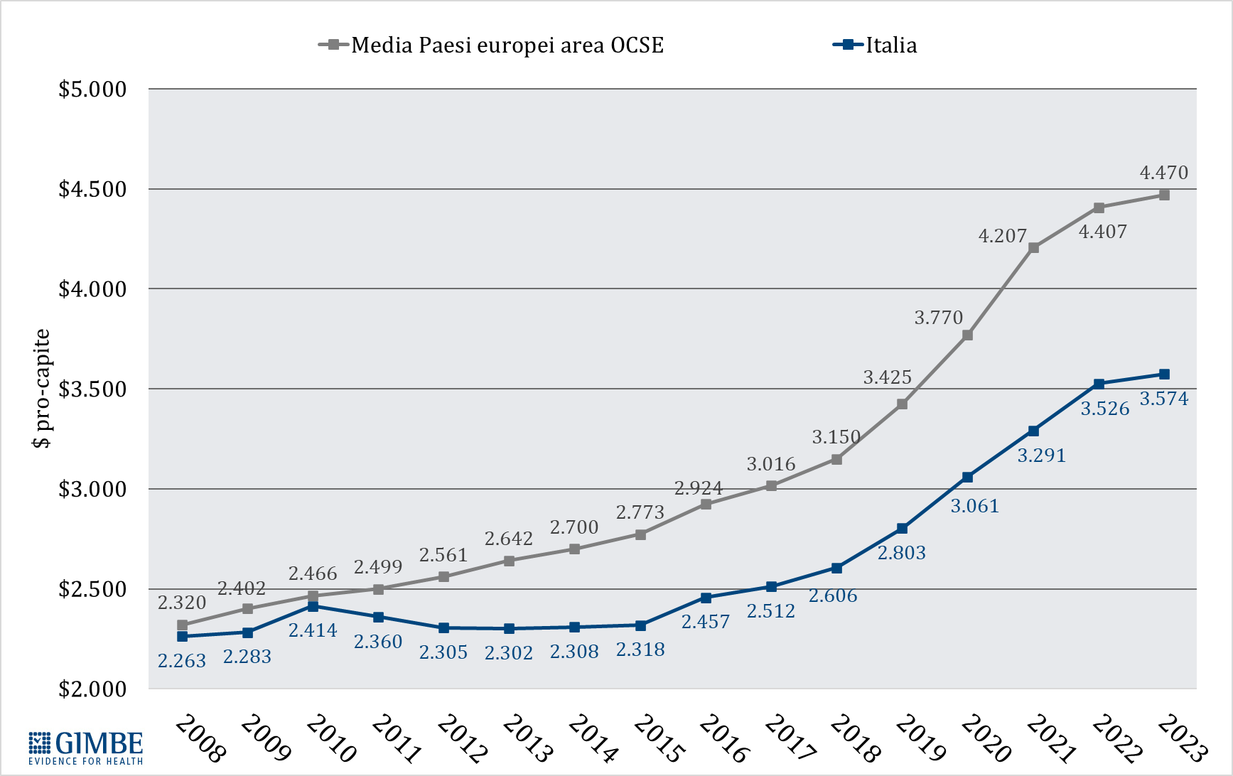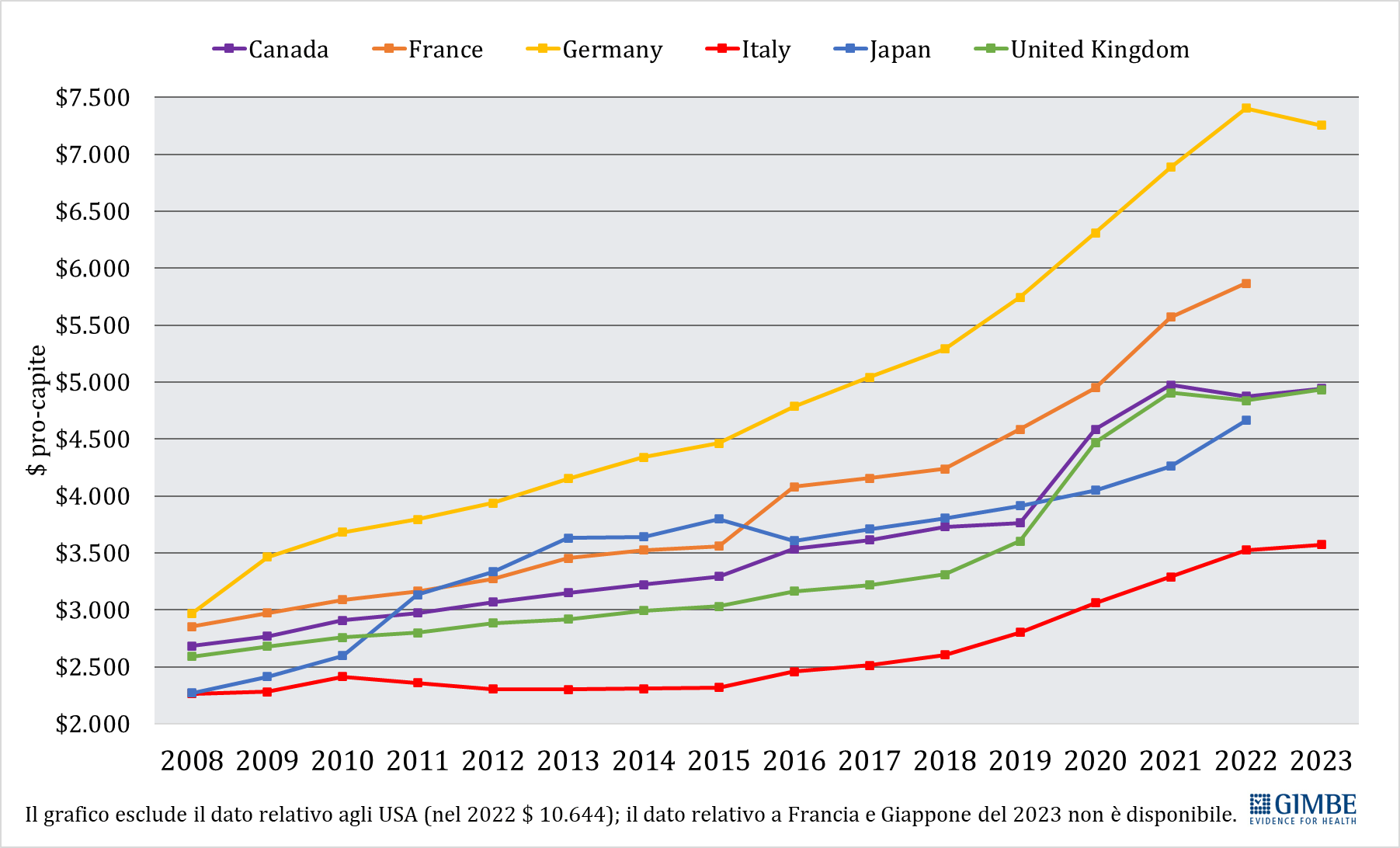 Infatti, nel 2023 rispetto al 2019, la spesa sanitaria pubblica pro-capite italiana è cresciuta di soli $ 772