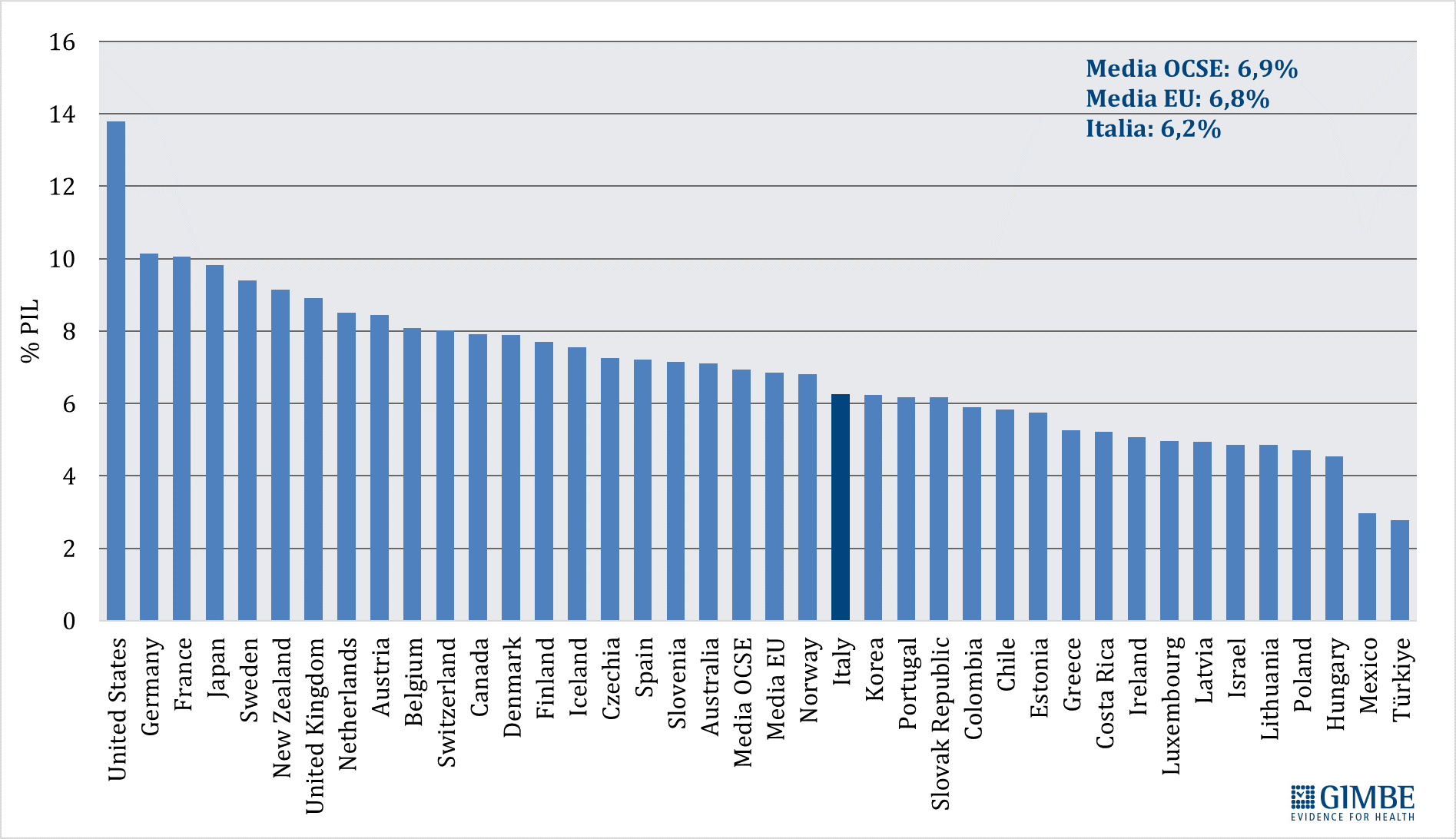 dell’area OCSE e in ultima posizione tra quelli del G7. La spesa sanitaria pubblica si attesta al 6,2% del PIL, percentuale inferiore sia rispetto alla media OCSE del 6,9%, sia rispetto alla media europea del 6,8%.