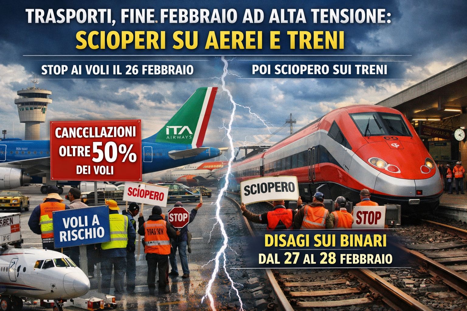 Il giorno successivo, giovedì 26 febbraio, si apre anche il fronte ferroviario. In serata scatterà uno sciopero che si protrarrà fino alla sera del 28 e che coinvolgerà Gruppo FS Italiane, Italo e Trenord. Le modalità di adesione variano a seconda delle sigle, ma l’impatto sul servizio potrebbe essere rilevante, con disagi anche prima dell’inizio e dopo la conclusione formale dell’astensione.