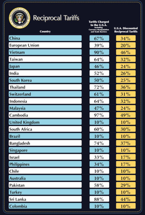L’ultima colonna è gialla con tutti i dazi imposti a partire da oggi: una tassa generale del dieci per cento su tutte le importazioni verso gli Stati Uniti e un ulteriore sistema di dazi reciproci fino al quarantanove per cento per i Paesi accusati di pratiche scorrette: trentaquattro per cento alla Cina, ventiquattro per cento al Giappone, venticinque per cento alla Corea del Sud, venti per cento all’Unione Europea. «Ci hanno saccheggiato per decenni. Ora si cambia», ha detto Trump.