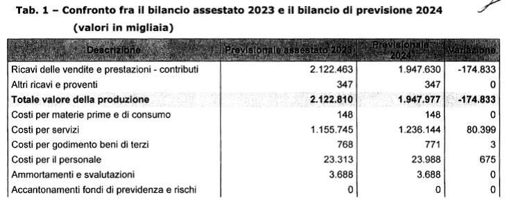 (Fonte: Relazione del Collegio dei Sindaci al Bilancio di Previsione 2024).