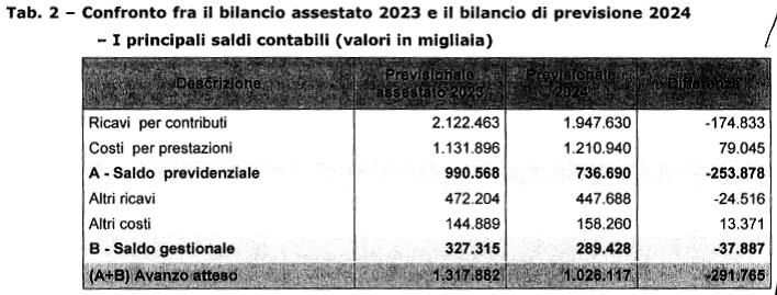 Per l’anno 2024 la differenza è riconducibile in parte anche alla previsione di un saldo tra oneri pensionistici e gettito contributivo di minore entità stimato nel bilancio di previsione rispetto a quanto ipotizzato nel bilancio tecnico per quell’anno.