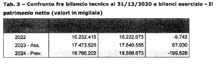 Il patrimonio netto del bilancio consuntivo 2022 e preventivo per l’anno 2023 risulta essere abbastanza in linea con quanto ipotizzato nelle previsioni di bilancio tecnico.