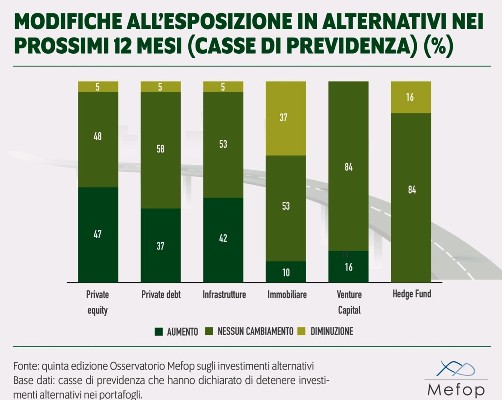Alla domanda riguardante il livello di soddisfazione della redditività, le casse rispondono positivamente: oltre l’80% degli enti definisce coerente la redditività attesa e quella effettivamente conseguita. Poche casse dichiarano di voler diminuire l’esposizione in alternativi nei prossimi 12 mesi, le uniche eccezioni si riscontrano nel settore immobiliare e negli hedge fund (vedi grafico 4).