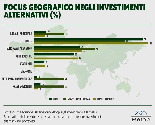 Tra le casse di previdenza, circa il 20% dichiara di prevedere strategicamente un focus geografico nella scelta degli investimenti alternativi; l’interesse si orienta in modo particolare verso il mercato italiano (75% delle casse che hanno un focus geografico), tendenza da imputare alla volontà di sostenere il sistema economico italiano, a vantaggio delle categorie professionali di riferimento. Apprezzabile anche l’attenzione rivolta agli altri paesi dell’area Euro.