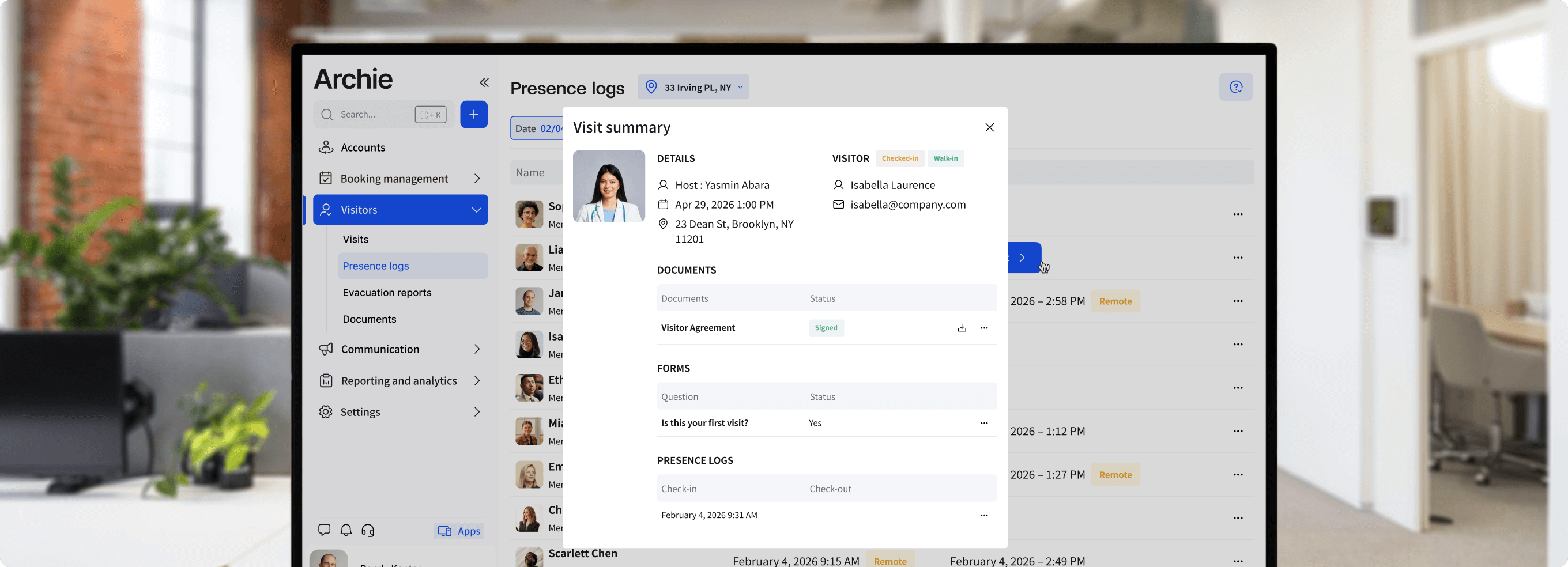 Archie offre report in tempo reale sulle persone presenti in sede, fondamentali in caso di evacuazione o incidente. I responsabili possono accedere immediatamente all’elenco aggiornato degli ospiti e del personale presenti nell’edificio, direttamente da dispositivo mobile.