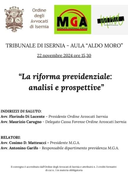 Parte da Isernia, con un convegno in presenza organizzato dal Coa locale con la collaborazione della nostra Mariagrazia Bove, una serie di incontri che il Movimento 19 Aprile del sindacato nazionale forense fisserà nei fori italiani per chiarire agli iscritti le luci (poche) e le ombre (purtroppo ancora tante) della riforma previdenziale da pochissimo approvata dai ministeri vigilanti.