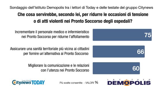 Proprio il miglioramento della comunicazione tra l’utenza e il personale di pronto soccorso viene menzionato dal 60 per cento degli intervistati nel sondaggio Demopolis. Per il 78 per cento è necessario incrementare il personale in modo da ridurre il sovraffollamento. Ritenuto appunto la causa principale delle tensioni. Emerge poi in modo evidente il bisogno di una sanità territoriale più vicina ai cittadini, che possa fornire un’alternativa ai pronto soccorso.