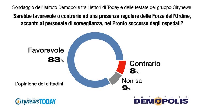 Sul punto, un sondaggio condotto da Demopolis tra i lettori delle testate Citynews evidenzia come la stragrande maggioranza degli intervistati (l’83 per cento) sarebbe favorevole ad una presenza regolare delle forze dell’ordine nei pronto soccorso, accanto al personale di sorveglianza.