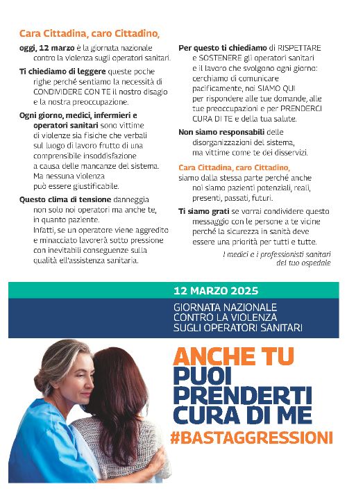Il messaggio lanciato il 12 marzo, sottolinea Migliore, è rivolto a tutti, utenti e personale: “Non possiamo limitarci a denunciare le aggressioni: dobbiamo cambiare la narrazione sulla sanità pubblica. Raccontare ogni giorno un Sistema sanitario in crisi perenne non aiuta a migliorarlo, ma esaspera gli animi di chi lavora e di chi ha bisogno di cure. Il rischio è che la denuncia diventi fine a sé stessa e sia percepita come un rumore di fondo che non risolve nulla, ma avvelena il dibattito pubblico. Oggi si parla solo delle criticità e poco di ciò che funziona: eppure, nonostante le difficoltà, il Sistema sanitario garantisce assistenza di qualità e raggiunge traguardi straordinari, anche nei contesti più difficili”.