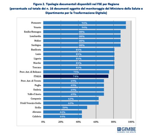 Documenti. Il Decreto del Ministero della Salute del 7 settembre 2023 ha definito i contenuti del FSE 2.0, ma ad oggi soltanto 4 documenti su 16 monitorati sul portale pubblico – lettera di dimissione ospedaliera, referti di laboratorio e di radiologia e verbale di pronto soccorso – risultano effettivamente disponibili in tutte le Regioni (figura 1). «Un cittadino siciliano e uno veneto – commenta Cartabellotta – non hanno le stesse possibilità di accesso alla propria documentazione clinica. E questo non è accettabile in un Servizio Sanitario Nazionale che si definisce universale». La disomogeneità regionale è marcata. Alcuni documenti fondamentali – come il profilo sanitario sintetico, le prescrizioni specialistiche e farmaceutiche, il referto specialistico ambulatoriale – sono disponibili in oltre l’80% delle Regioni. Il certificato vaccinale e il documento di erogazione delle prestazioni specialistiche sono presenti in 15 Regioni e Province Autonome (71%), mentre il documento di erogazione dei farmaci e la scheda della singola vaccinazione compaiono nei FSE di 14 Regioni (67%). Il referto di anatomia patologica e il taccuino personale dell’assistito sono accessibili in 13 Regioni (62%). Soltanto 6 Regioni rendono disponibile la lettera di invito per screening, vaccinazioni e altri percorsi di prevenzione, mentre la cartella clinica è resa disponibile nel FSE solo dal Veneto (tabella 1). Complessivamente, a livello nazionale il FSE mette a disposizione degli utenti il 68% dei documenti monitorati sul portale del FSE 2.0 e previsti dal decreto. Nessuna Regione alimenta il FSE con tutte le tipologie documentali previste dal DM: si va dal 93% del Piemonte e del Veneto al 40% di Abruzzo e Calabria (figura 2).