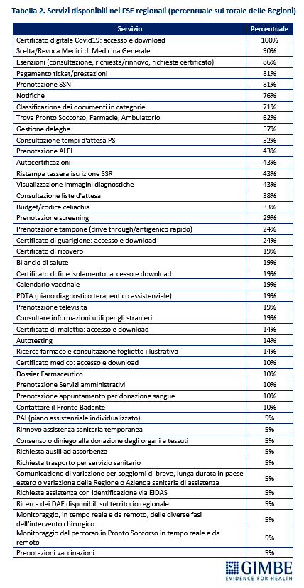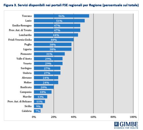 Servizi. Attualmente, i FSE regionali offrono fino a 45 servizi digitali (tabella 2), che permettono ai cittadini di svolgere varie attività fondamentali: dal pagamento di ticket e prestazioni alla prenotazione di visite ed esami, dalla scelta del medico di medicina generale alla consultazione delle liste d’attesa. Anche su questo fronte, però, il divario tra Regioni è profondo. Solo la Toscana (56%) e il Lazio (51%) superano la soglia del 50% dei servizi attivati. All’estremo opposto, in Calabria la disponibilità si ferma al 7% (figura 3). «È utile precisare – spiega Cartabellotta – che molti dei servizi digitali sono accessibili tramite altri canali, come portali web o app offerti dalle Regioni. Tuttavia, se questi non vengono integrati anche nel FSE, da un lato si perde l’obiettivo di creare un’unica piattaforma digitale per il cittadino, dall’altro il monitoraggio nazionale restituisce una fotografia parziale e sottostimata dell’effettiva disponibilità dei servizi offerti»