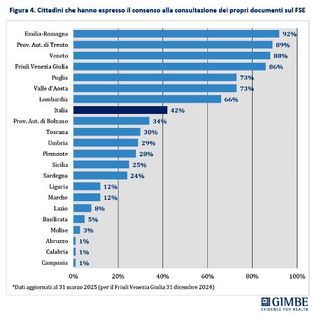 Consenso alla consultazione. Al 31 marzo 2025 (per il Friuli Venezia Giulia i dati sono aggiornati al 31 dicembre 2024), a livello nazionale solo il 42% dei cittadini ha espresso il consenso alla consultazione dei propri dati sanitari da parte dei medici. Ma il divario tra le Regioni è enorme: si passa dall’1% in Abruzzo, Calabria e Campania al 92% in Emilia-Romagna. Tra le Regioni del Sud, solo la Puglia (73%) supera la media nazionale (figura 4). «Fornire il consenso è il primo passo per accedere ai benefici del FSE – sottolinea Cartabellotta – ma serve un grande sforzo informativo e culturale per rafforzare la fiducia dei cittadini, superando i timori legati alla protezione dei dati personali».