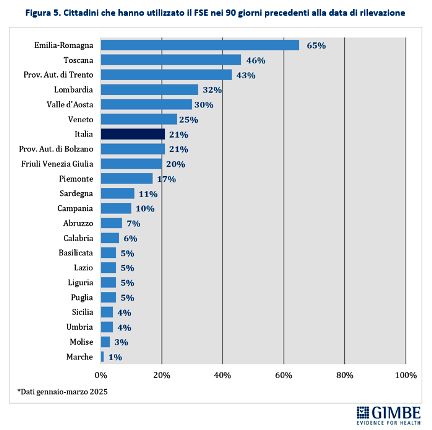 Utilizzo del FSE. Tra gennaio e marzo 2025, appena il 21% dei cittadini ha consultato almeno una volta il proprio FSE, considerando esclusivamente chi ha avuto almeno un documento caricato. Anche in questo caso le disparità regionali sono marcate: si va dall’1% delle Marche al 65% dell’Emilia-Romagna (figura 5). Nel Mezzogiorno, l’utilizzo resta sotto l’11%. «Non basta caricare i dati nel fascicolo – spiega Cartabellotta – bisogna anche mettere le persone nella condizione di usarli. E questo significa investire seriamente in alfabetizzazione digitale».