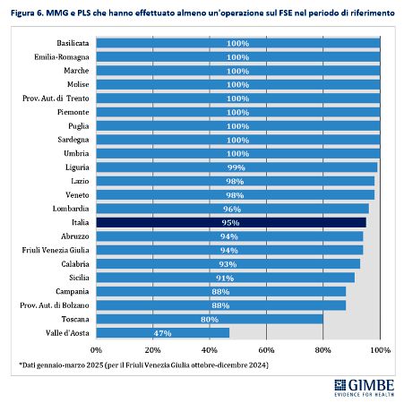 Utilizzo da parte di Medici di Medicina Generale e Pediatri di Libera Scelta. Tra gennaio e marzo 2025 (ottobre-dicembre 2024 per il Friuli Venezia Giulia), il 95% dei Medici di Medicina Generale e Pediatri di Libera Scelta ha effettuato almeno un accesso al FSE. Nove Regioni raggiungono il 100% di utilizzo: Basilicata, Emilia-Romagna, Marche, Molise, Provincia Autonoma di Trento, Piemonte, Puglia, Sardegna e Umbria. Anche nelle restanti Regioni il tasso di utilizzo si mantiene elevato: Liguria (99%), Lazio e Veneto (98%), Lombardia (96%). Si collocano leggermente sotto la media nazionale Abruzzo e Friuli Venezia Giulia (94%), Calabria (93%), Sicilia (91%), Campania e Provincia Autonoma di Bolzano (88%), Toscana (80%) e Valle d’Aosta (47%) (figura 6).