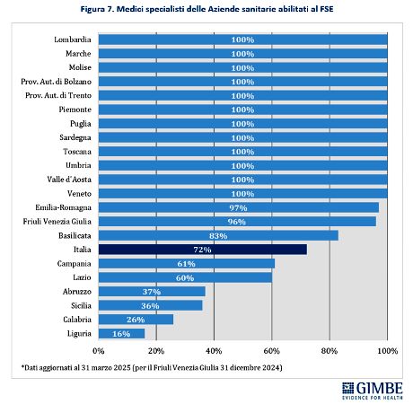 Utilizzo da parte di medici specialisti. Al 31 marzo 2025 (31 dicembre 2024 per il Friuli Venezia Giulia), il 72% dei medici specialisti delle Aziende sanitarie risulta abilitato alla consultazione del FSE. Anche in questo caso, le differenze tra Regioni restano marcate. Dodici Regioni e Province Autonome hanno raggiunto il 100% di abilitazioni: Lombardia, Marche, Molise, Province Autonome di Bolzano e Trento, Piemonte, Puglia, Sardegna, Toscana, Umbria, Valle d’Aosta e Veneto. Sotto la media nazionale si collocano Campania (61%), Lazio (60%), Abruzzo (37%), Sicilia (36%) e Calabria (26%). Fanalino di coda la Liguria, con appena il 16% di medici specialisti abilitati alla consultazione del FSE (figura 7).