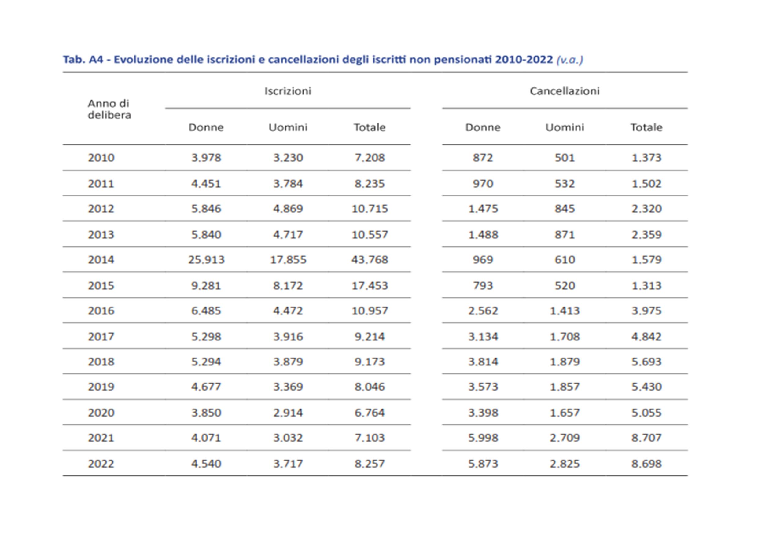 Purtroppo l’aspetto demografico è molto negativo perché caratterizzato, oltre che da una contrazione dei nuovi ingressi, da un aumento esponenziale delle cancellazioni come dichiarato da Cassa Forense nel prospetto che allego:
