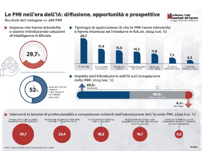 Piccole e medie imprese interessate a sfruttare le potenzialità dell’IA, nonostante non si conoscano ancor bene i perimetri e le ricadute applicative e sociali dei nuovi sistemi. È, in sintesi, l’orientamento delle PMI verso l’Intelligenza Artificiale, che emerge dall’indagine promossa in occasione del Festival del Lavoro dalla Fondazione Studi Consulenti del Lavoro in collaborazione con Confapi su un campione di 488 imprese, appartenenti principalmente al settore manifatturiero e rappresentative di tutta Italia. Circa l’11% delle imprese coinvolte ha già sviluppato sistemi di IA e quasi un terzo (29,7%) è attualmente impegnato in iniziative di diverso tipo, che vanno dalla realizzazione di progetti pilota (9,1%) alla partecipazione ad attività formative e informative in materia (13,9%). Ciò che ostacola una maggiore diffusione dell’IA tra le imprese è la scarsa conoscenza dei nuovi sistemi. Il 48,6% del campione ritiene, infatti, che sia questo il principale ostacolo. E con riguardo alla tipologia di applicazioni presenti nelle Pmi emerge un approccio graduale: tra le più diffuse, quelle che consentono una più rapida ed efficace analisi dei dati (il 29,7% le ha introdotte o le sta introducendo) e, a seguire, i sistemi per l’automazione dei processi (17,4%) o di assistenza alla clientela tramite chatbot o applicazioni simili (15,5%). Importanti per le imprese le ricadute che l’introduzione dei sistemi di IA può avere sulla platea dei lavoratori sia in termini di rischi che di opportunità. Tra queste ultime spicca l’effettivo supporto che le nuove tecnologie possono offrire ai loro collaboratori in termine di riduzione dei carichi lavorativi (42,9%). A seguire, il 39,1% valuta le opportunità derivanti dalla sostituzione di attività ripetitive e di routine e circa un terzo intravede un complessivo miglioramento della qualità del lavoro (32,6%). Lo spiazzamento dei lavoratori più anziani e, in generale, meno digitalizzati è giudicato come il rischio principale (42,6%). In ogni caso, l’investimento nei nuovi sistemi IA non rappresenterà per le imprese intervistate un rischio per l’occupazione, anzi il contrario.