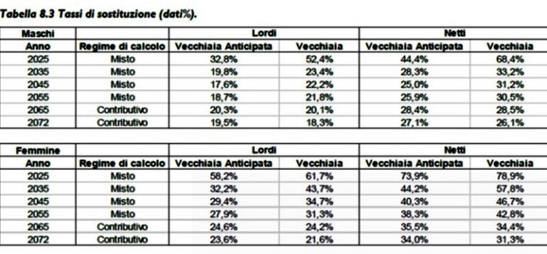 Nella Tabella 8.3. vengono riportati i tassi di sostituzione al lordo ed al netto del prelievo fiscale e contributivo, riferibili per anno di proiezione al valore medio pro-capite relativo alla coorte di nuovi ingressi in pensione. I dati rappresentati si riferiscono rispettivamente agli iscritti di sesso femminile e di sesso maschile e classificati per regime previdenziale di computo della pensione di vecchiaia e di vecchiaia anticipata.